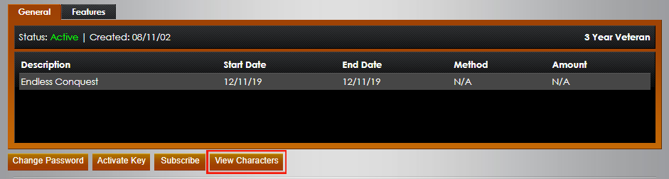 To access the character list for a given game account, simply login to the Account Center, scroll down to the relevant account summary, and then click the new “View Characters” button: