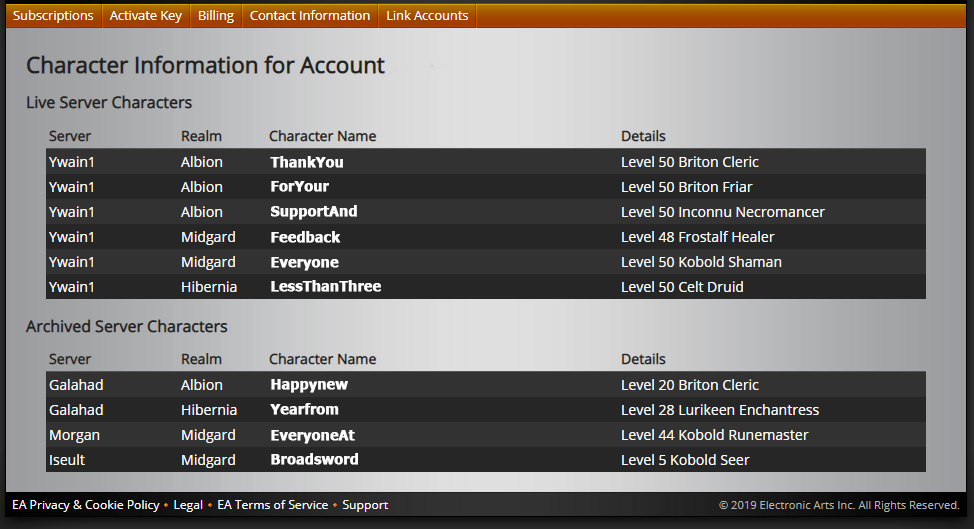 To access the character list for a given game account, simply login to the Account Center, scroll down to the relevant account summary, and then click the new “View Characters” button: