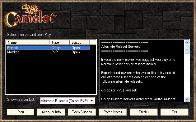Experienced players who would like to try our PvE Ruleset server, Gaheris, select the “Alternate Ruleset” server list from the “Shown Server List” dropdown.